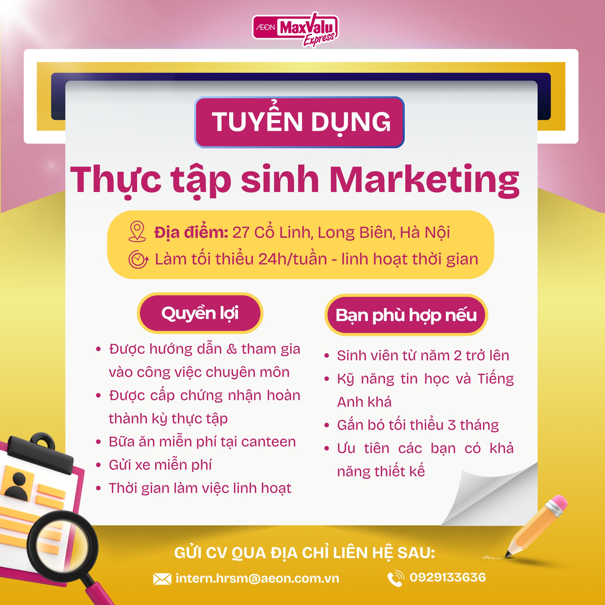 - Hỗ trợ nhân viên MKT tổ chức các sự kiện bán hàng, chương trình khuyến mãi và các hoạt động gắn kết khách hàng tại các cửa hàng MaxValu.