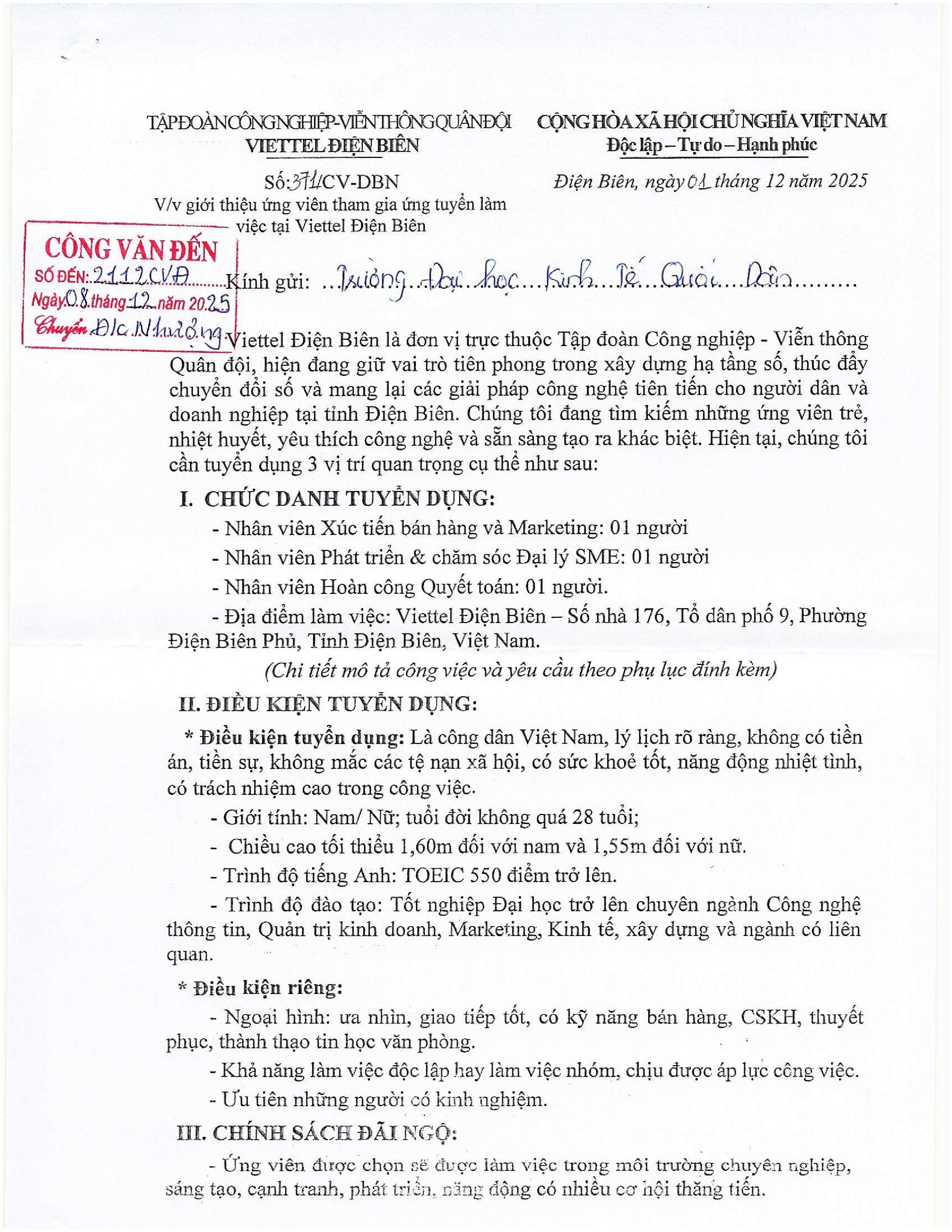 Viettel Điện Biên tuyển dụng 3 vị trí / 5 days ago