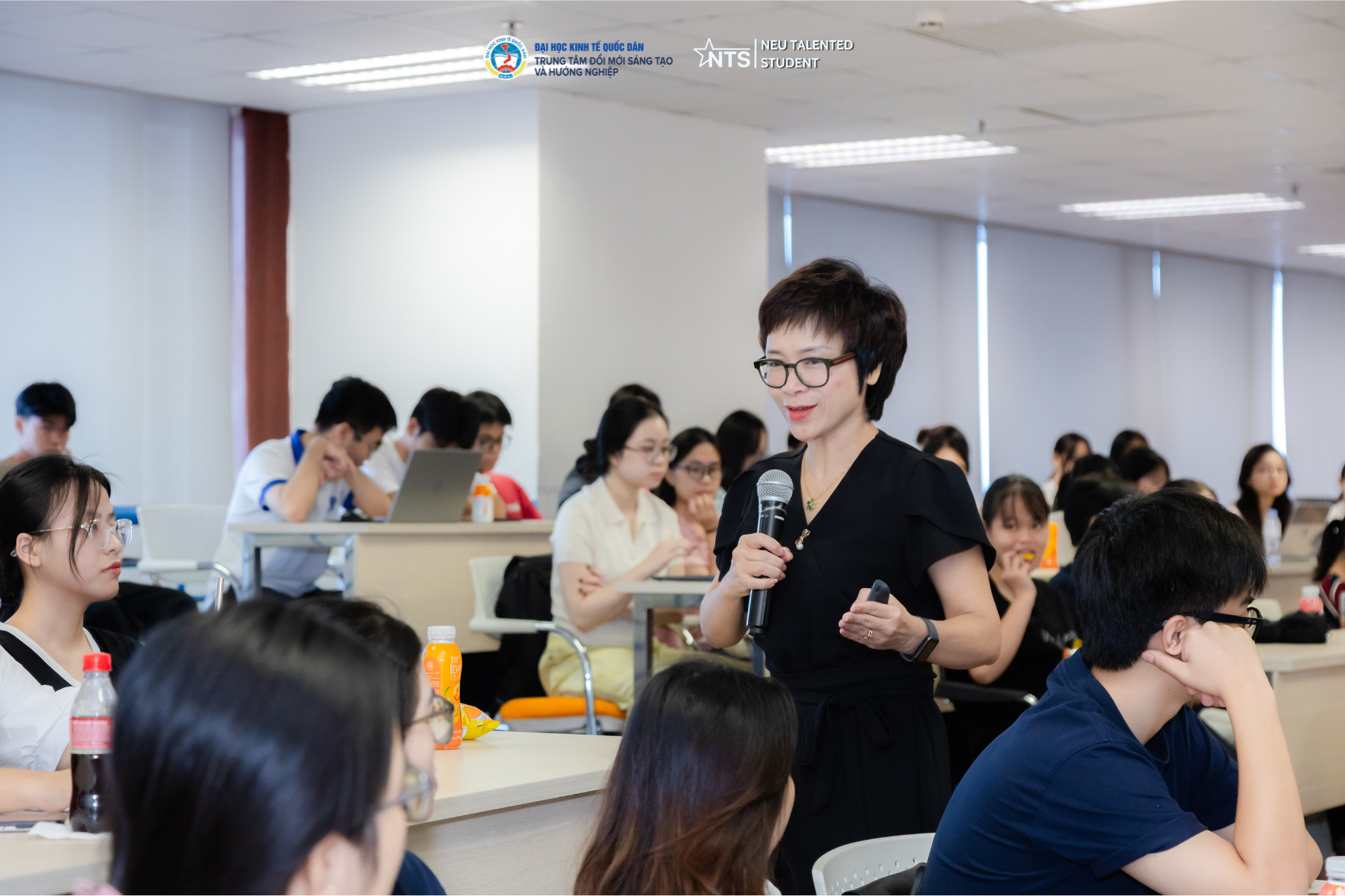 ThS. Nguyễn Phương Linh - Phó Giám đốc Trung tâm Đổi mới sáng tạo và Hướng nghiệp chia sẻ chung về Dự án NEU Talented Student đã tạo nên một không gian rộng mở để học hỏi, kết nối và truyền cảm hứng - nơi sinh viên được định hướng đúng đắn, phát triển bản thân và sẵn sàng trở thành nguồn nhân lực chất lượng cho thị trường lao động nói chung. Về chuỗi Cafe Career Talk, ThS Nguyễn Phương Linh cho biết đây là hoạt động thường niên được tổ chức vào thứ 7 đầu tiên hàng tháng, với mục tiêu giúp các bạn sinh viên tiếp cận thông tin dưới góc độ thực tiễn về nghề nghiệp từ những chuyên gia, người có kinh nghiệm lâu năm để phần nào đó giúp các bạn sinh viên hiểu sớm hơn về những khó khăn và thách thức từ công việc sau này sẽ phải đối mặt, từ đó chuẩn bị những kiến thức và kỹ năng cần thiết để đáp ứng đòi hỏi thực tế từ công việc