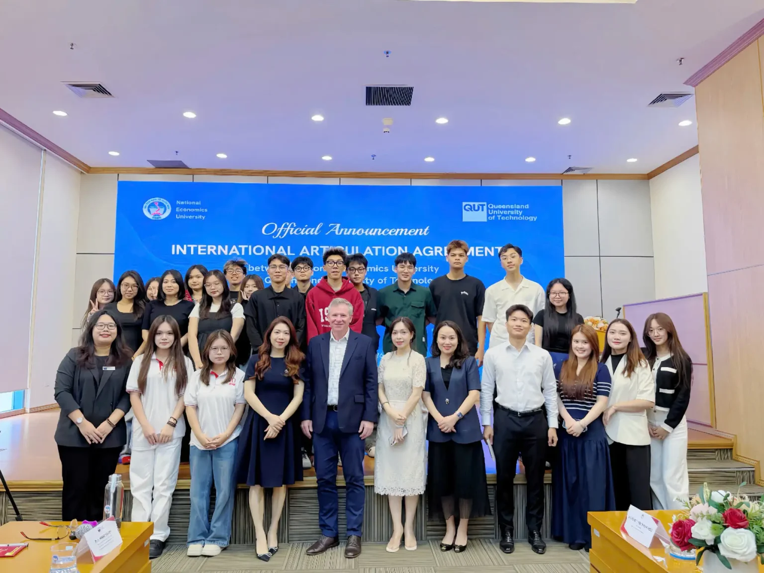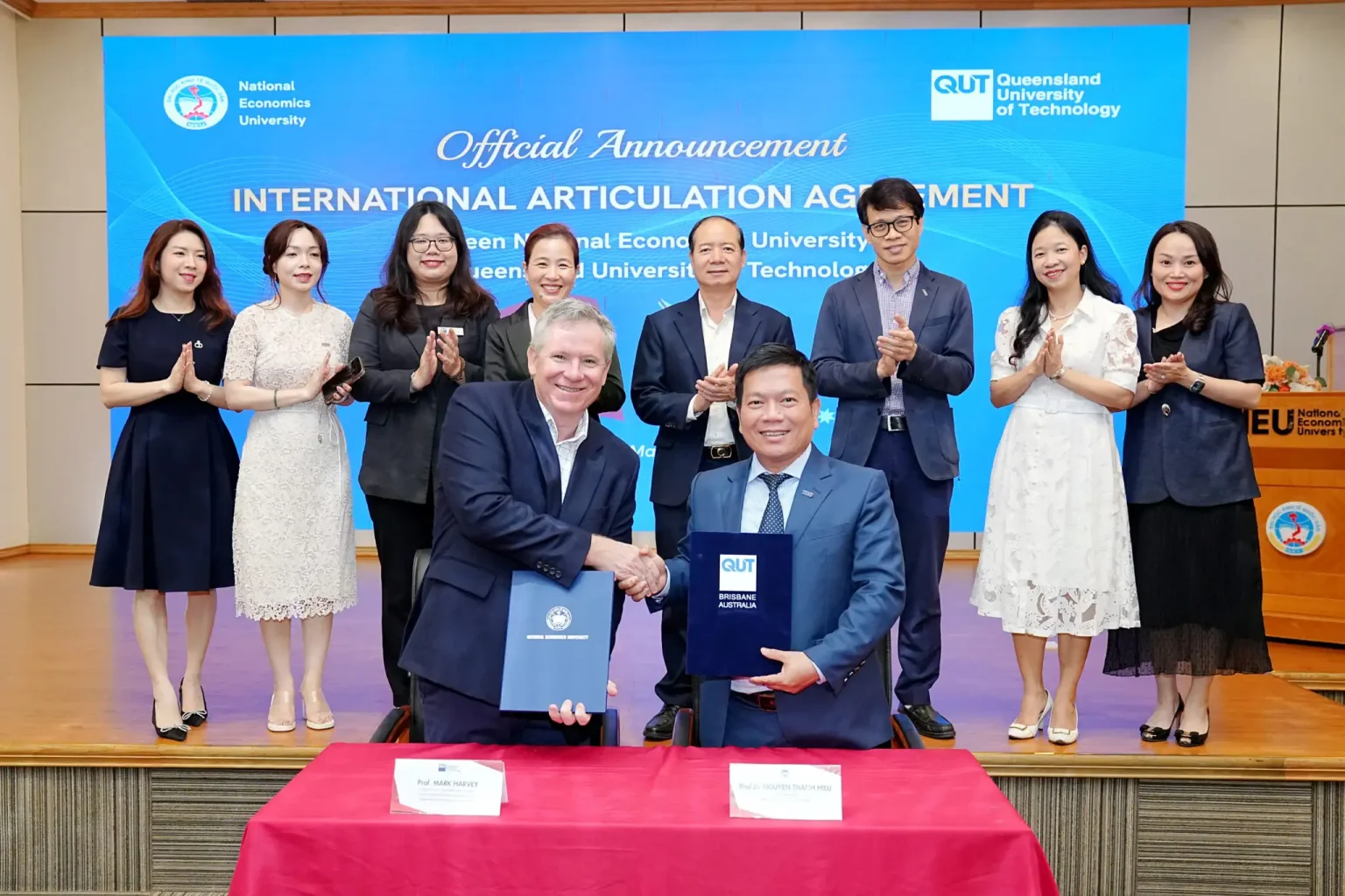 Tại buổi lễ, đại diện lãnh đạo hai trường đã tiến hành nghi thức trao thỏa thuận hợp tác (MOA) dưới sự chứng kiến của đông đảo giảng viên và sinh viên. Khoảnh khắc này chính thức xác lập quan hệ đối tác giữa Đại học Kinh tế Quốc dân và Đại học Công nghệ Queensland, mở ra hướng hợp tác mới trong việc phát triển các chương trình đào tạo theo chuẩn quốc tế.