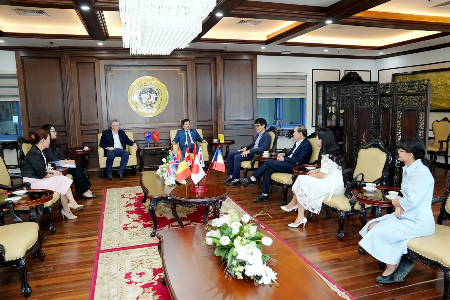 Về phía Đại học Kinh tế Quốc dân có: GS.TS Nguyễn Thành Hiếu – Phó Giám đốc Đại học; TS. Đào Thanh Tùng – Trưởng phòng Hợp tác Quốc tế; PGS.TS Lê Trung Thành – Viện trưởng Viện Đào tạo Quốc tế; cùng đại diện lãnh đạo các Trường, Phòng ban, Khoa, Viện, Trung tâm.