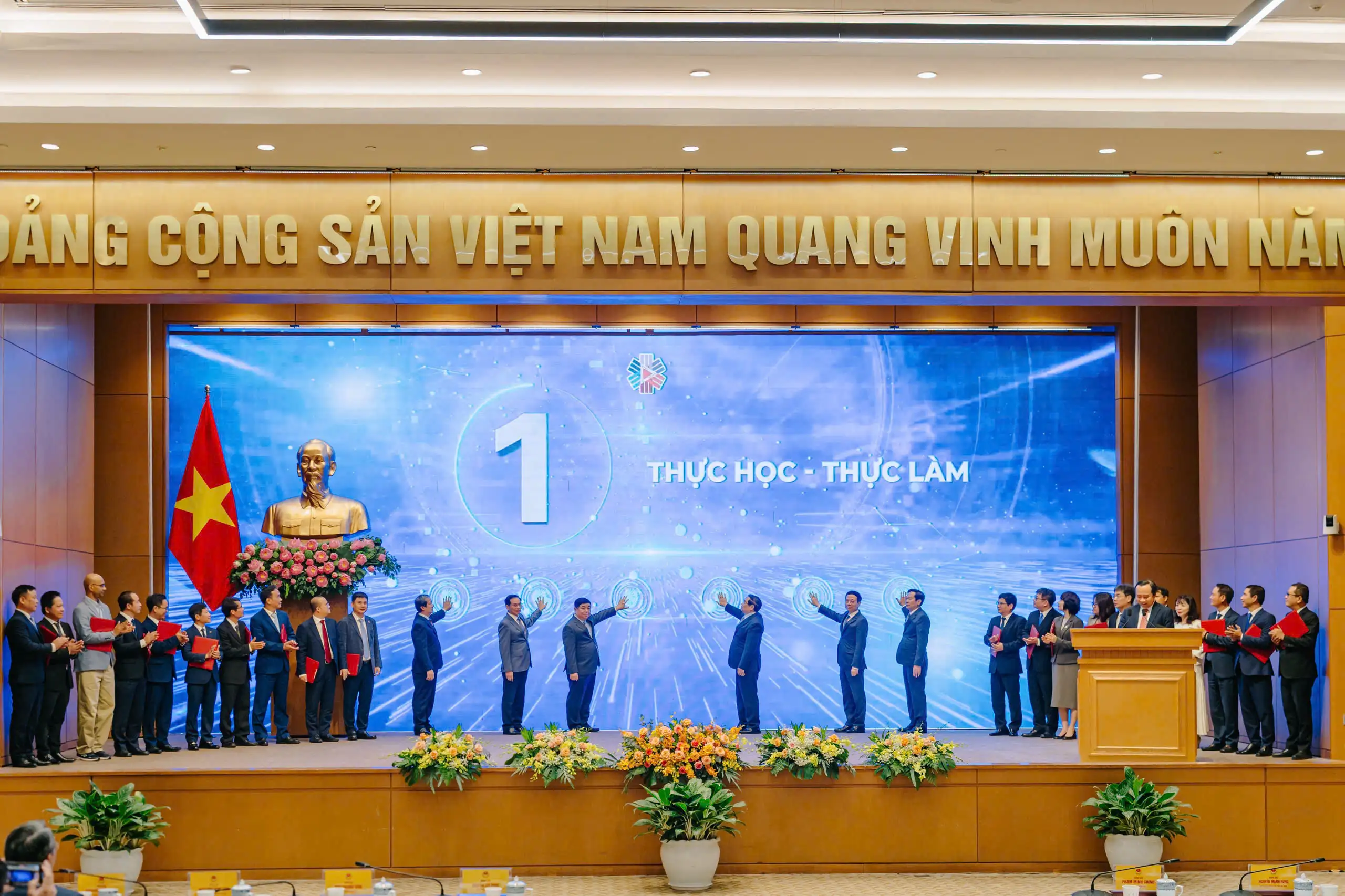 Thủ tướng và các đồng chí lãnh đạo bộ, ngành, đại diện các cơ sở giáo dục đại học và doanh nghiệp thực hiện nghi thức phát động chương trình “Học từ việc làm thực tế”