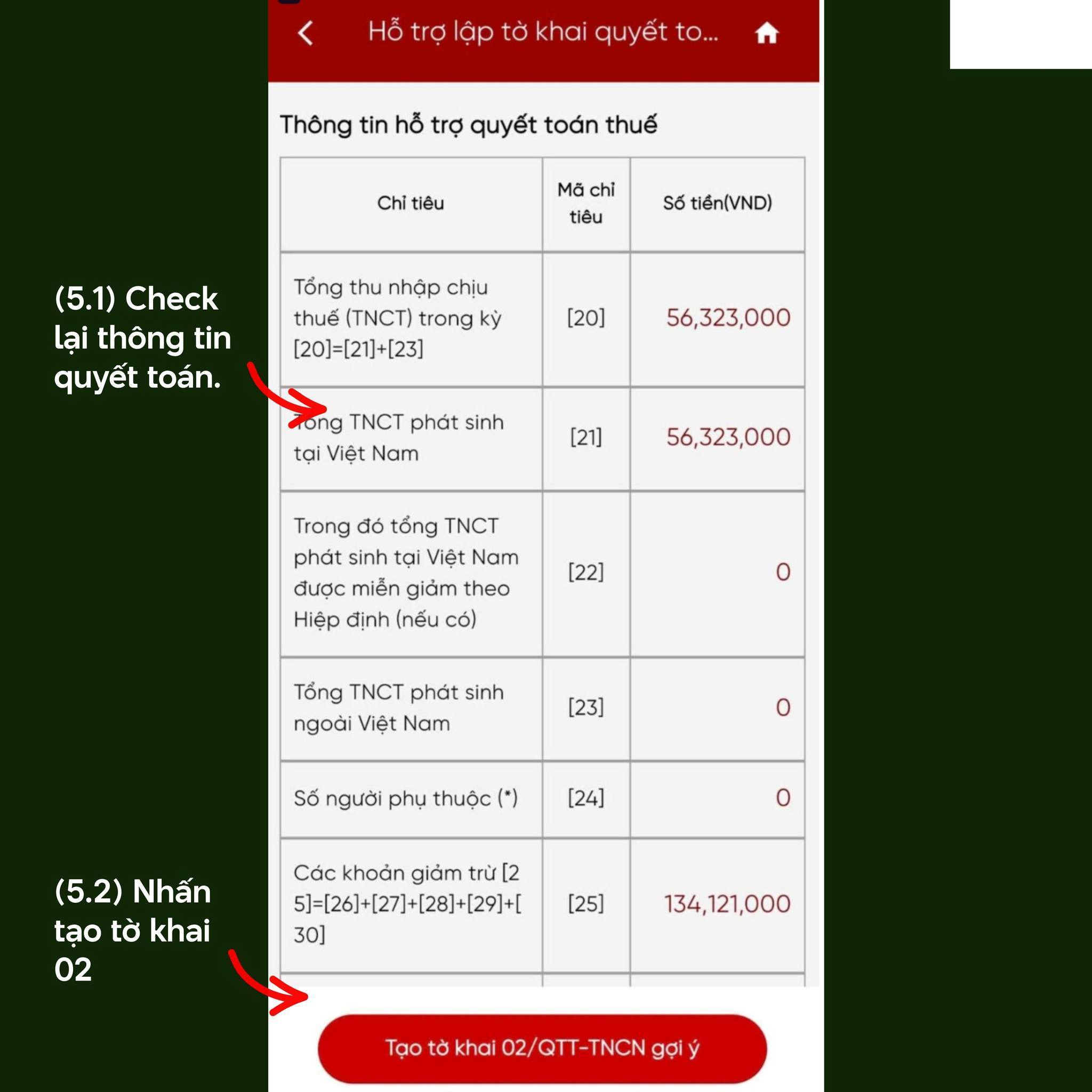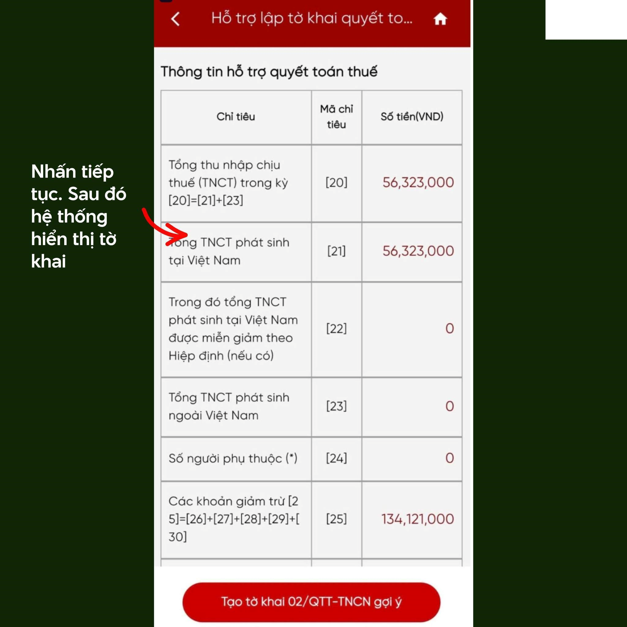 Chọn menu "Hỗ trợ quyết toán thuế TNCN", tiếp theo chọn "Hỗ trợ lập tờ khai quyết toán", chọn năm quyết toán và tra cứu. Hệ thống tự động lấy dữ liệu thu nhập và khấu trừ. Cần kiểm tra kỹ số liệu; nếu sai lệch thì liên hệ lại công ty. Có thể nhấn "Tạo tờ khai 02/QTT-TNCN" để tạo dự thảo, rồi nhấn "Tiếp tục".