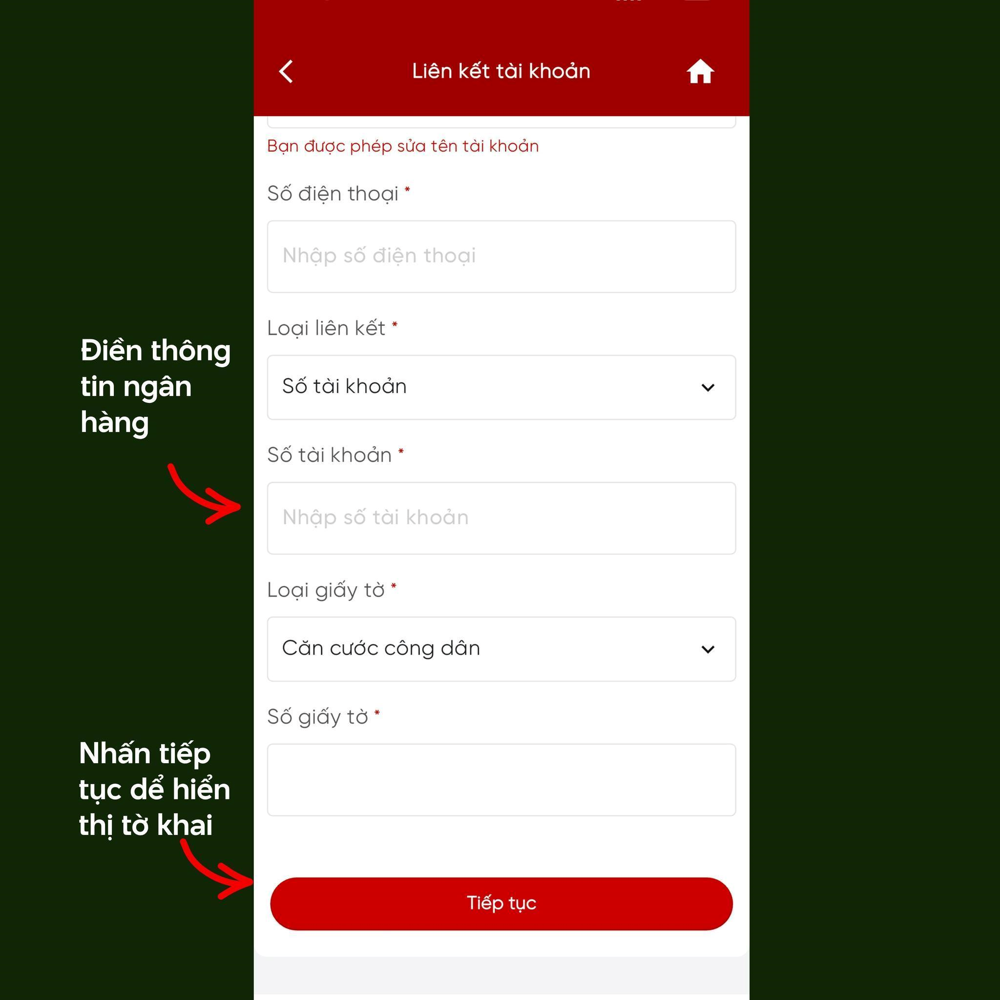 Nhấn "Tiếp tục", hệ thống yêu cầu nhập thông tin tài khoản ngân hàng để nhận tiền thuế hoàn (nếu có).